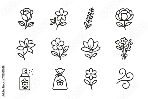 Floral bottle rose sprig grid mist icon jasmine sachet scented cherry vector