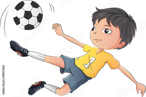 A dynamic and cheerful cartoon illustration of a young boy playing soccer, shown in full color with a focus on his energetic movement and the soccer ball