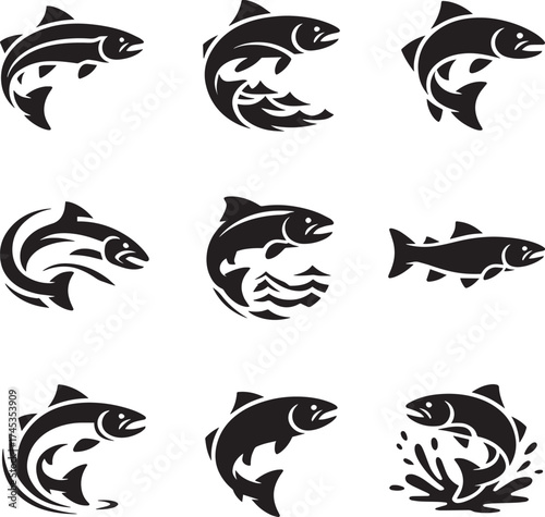 Stylized black and white illustration of a leaping salmon catching a fly lure