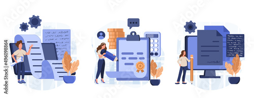 Document approval with quality seal set. Tiny people approve checklist in paper form, business decision and paperwork with round stamp, legal license file in mobile app cartoon vector illustration