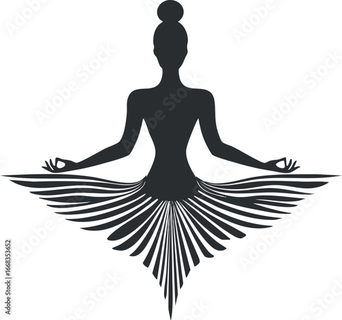 minimalist meditation icon showing seated figures in lotus pose with hand mudra, black and white vector symbol of mindfulness and calm