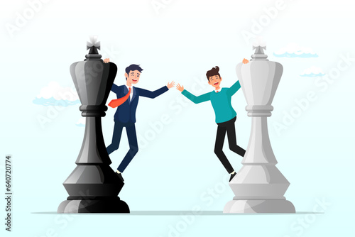 Flat illustration of two businessmen handshake on balance seesaw success negotiation business partnership deal merger agreement