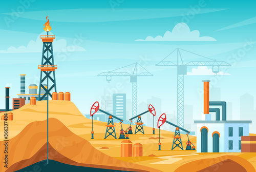 Cartoon oil well with drilling petroleum towers. Pump rig industry extraction derrick stations, fuel and gas transportation heavy machinery facility plants, isolated vector illustrations