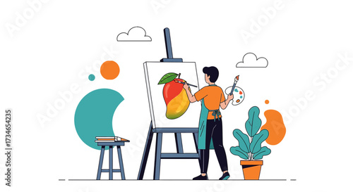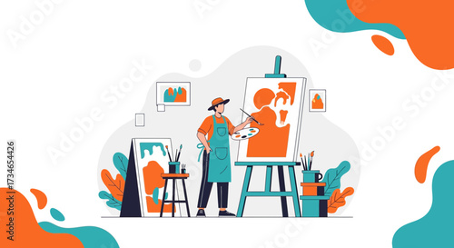 Cartoon artist painting on canvas with easel illustration for art education and creative hobby design