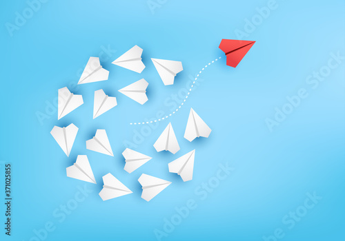 Different business concept.Red paper plane changing direction from white paper plane. new ideas. paper art style. creative idea. vector ,illustration.