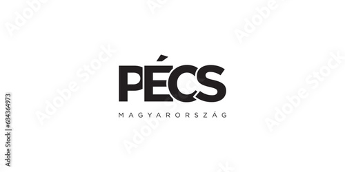 Pecs in the Hungary emblem. The design features a geometric style, vector illustration with bold typography in a modern font. The graphic slogan lettering.