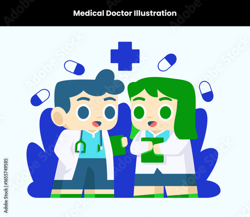 Pill blister pack, medicine bottles, and a scribbled medical signature depict healthcare, pharmacy, prescription, medication use, health management, hospital settings, and safety concepts in a simple