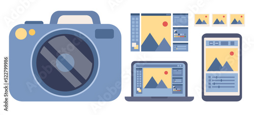 Photo editing icon set. Photography workshop, processing workshop, photo portfolio creation concept. Photographer. Content maker. Social media post creator. Vector flat illustration