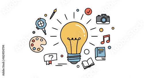 Inspiring Creative Process: Light Bulb surrounded by art, music, books and photography elements