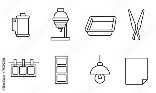 Set of doodle linear icons. Equipment for photography and film processing. Printing of finished photos. Camera, film, memory card, lens. Linear vector set