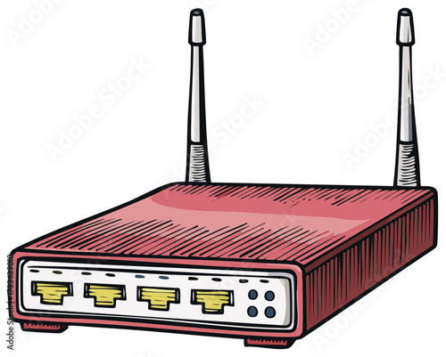 Cartoon illustration of a router with antennas and internet network ports.