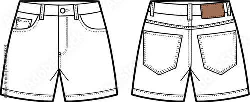 Athletic shorts front and back view, fashion design template, sportswear garment illustration, elastic waistband with drawstring, vector apparel mockup, clothing design reference
