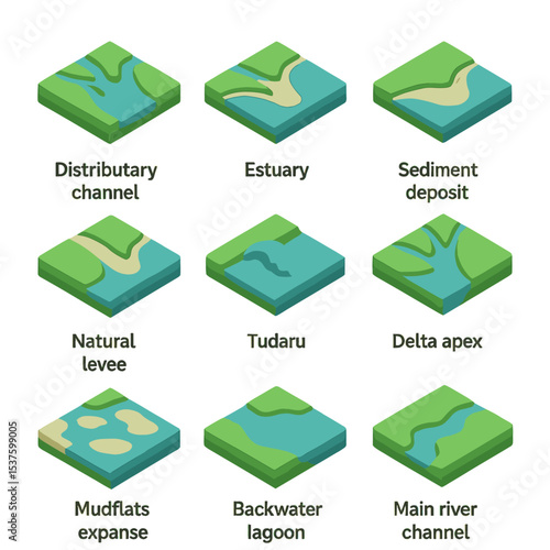River Delta Icon Set. Isometric Flat icon set of river delta geomorphology: distributary channel, estuary mouth, sediment deposit,