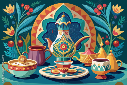 Vector Breakfast spread featuring food tableware and decorative elements.