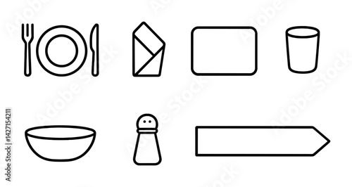Dining essentials outline icons set – linear style tableware and kitchen symbols for restaurant and hospitality: plate, utensils, napkin, salt shaker, bowl, glass, menu