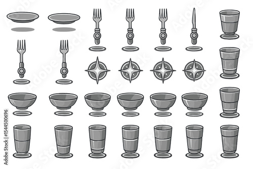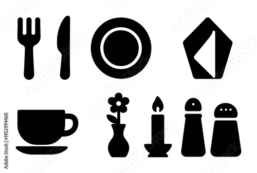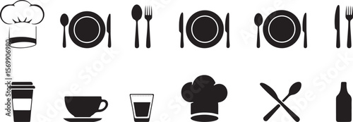 Set of monochrome icons featuring tableware items like plates, forks, knives, bowls, and glasses.