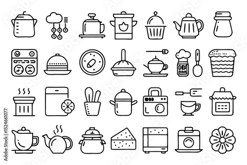 Collection of outline icons for kitchenware and tableware isolated on transparent background