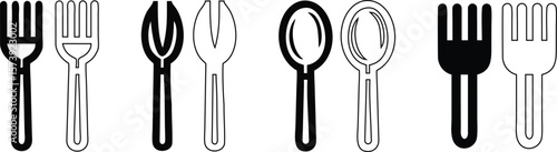 Spoon fork knife plate icon set line menu logo silhouette cutlery tableware dining utensil kitchen vector illustration restaurant service food flat design.