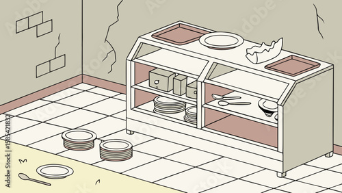 Empty buffet display case with cracked walls and scattered tableware isolated on white background