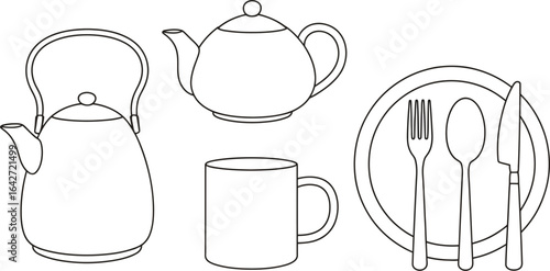 Kitchenware line art vector illustration tea set tableware