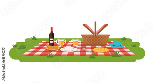Flat picnic scene with wine, basket, and tableware on checkered blanket