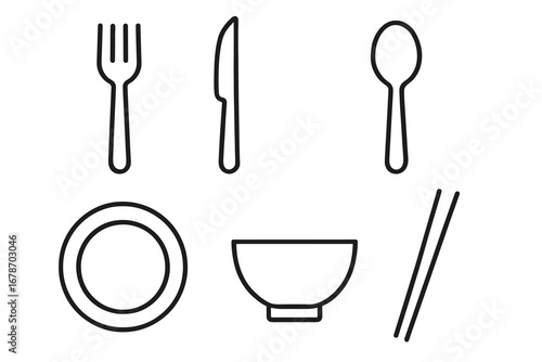 Outline of tableware set with plate, bowl, fork, knife, spoon, and chopsticks
