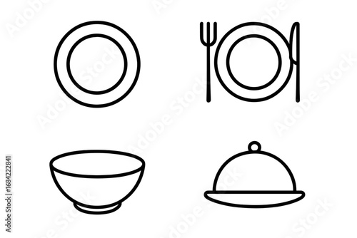 Set of food and restaurant line icons. Plate, bowl, fork, knife and cloche. Minimalistic pictograms for menu, web, app. Vector illustration of dinner tableware symbols.