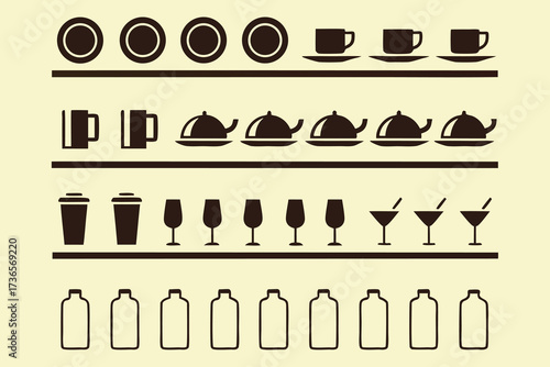 Minimalist line art illustration of kitchen shelves with plates, teapots, cups, and mugs, elegant dishware design for home decor, culinary themes, and interior kitchen concepts.