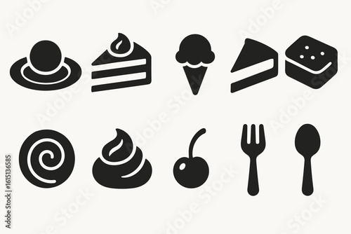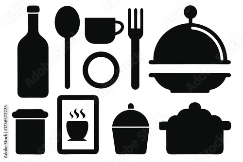 Food and dining silhouette icon set. kitchen, dessert, meal, tableware icons collection