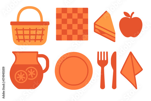 Orange and red collection of picnic essentials: basket, blanket, sandwich, fruit, and tableware