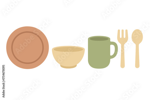 Minimalist set of reusable eco-friendly tableware including plate, bowl, mug, fork, and spoon in earthy colors