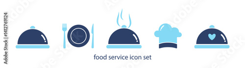 Catering icon set. Containing fork, spoon, knife, plate, cloche, tray, chef hat, beverage, food, dining table, and waiter. Cutlery or tableware in restaurant. Vector illustration.