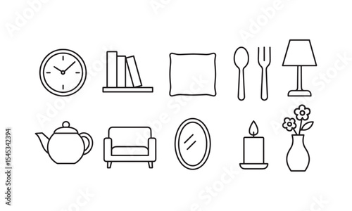 Black Line Icons Set Home Interior Objects Clock Books Pillow Spoon Fork Lamp Teapot Armchair Mirror Candle