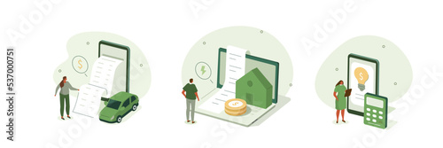 Sustainability illustration set, Characters calculating and paying electricity, utilities and household invoice bills. Home finances management and sustainable housing concept, set isometric vector il