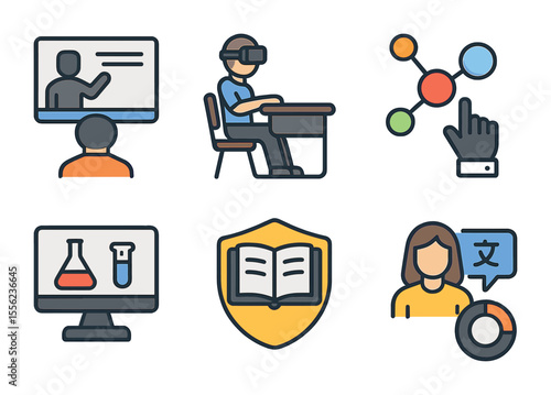 Online learning icon collection set. Containing distance learning, virtual classroom, blended learning, online course, e-learning, gamification, homeschooling icon. Simple flat vector illustration.