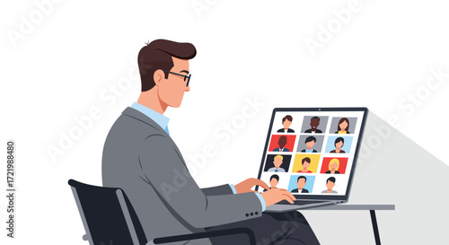 webinar online virtual meeting concept, remote working or work from home and anywhere, man using video conference via computer laptop screen, vector flat illustration