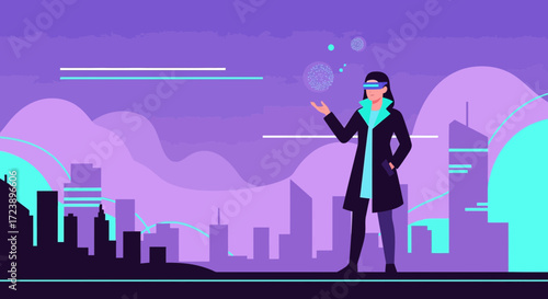 woman experiencing virtual reality using looking ocean. Metaverse digital cyber world technology vector background illustration