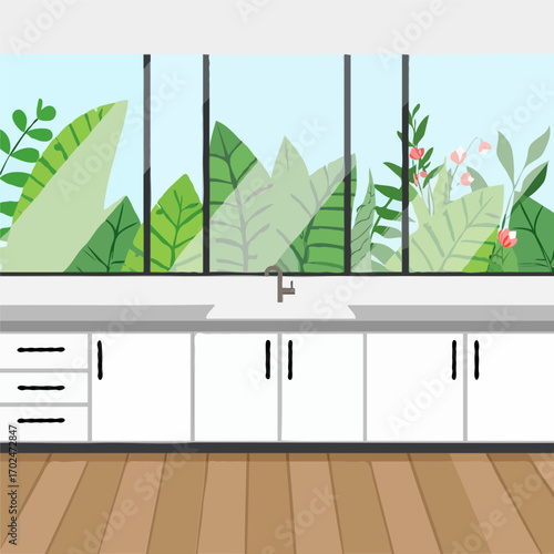 Vector art of modern minimalist kitchen interior with large windows offering a scenic view of lush greenery and trees, featuring an island and sleek cabinetry