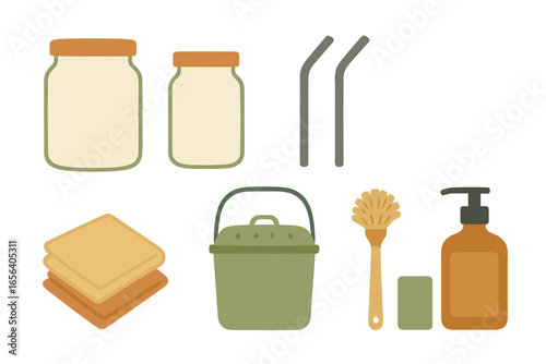 Cleaning supplies icons set for graphic design use. Flat design icons with no people present show various cleaning product elements.
