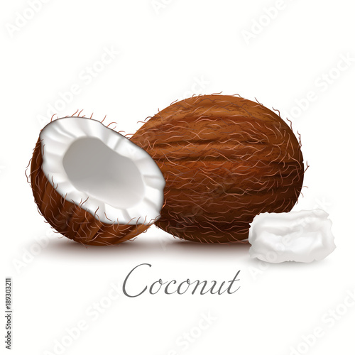 Vector coconut isolated on white background. A whole unpeeled, half and pieces of coconut.