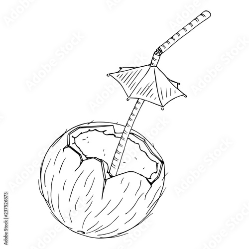 Summer tropic coconut cocktail. Exotic fruit hawaiian drink hand drawn art. Cool doodle vector illustration isolated white background. Trendy line art for coloring book, t-shirt print, logo design