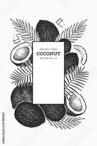 Vector frame with coconuts and tropical leaves .Hand drawn. Vintage style