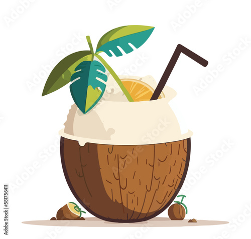 Fresh tropical cocktail in coconut half. Refreshing beach drink decorated with umbrella and straw. Colored flat vector illustration isolated on white background