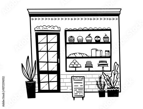 A vintage bakery storefront with pastries and bread displayed in black and white sketch vector style, ideal for food-related branding
