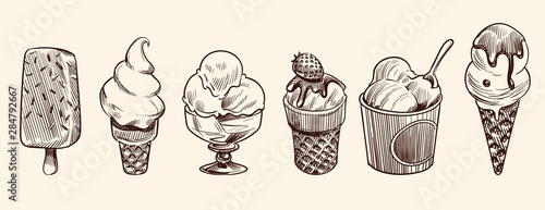 Ice cream Hand drawn doodle set. Different types, waffle cone, cup ice cream, popsicle, sundae. Sketch style cafe menu, card, birthday card decoration.