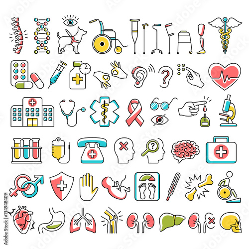 Disability icon vector set design. Outline icon of disability symbol, certain activities, equitable access, difficulties, society, cognitive and developmental. Vector illustration.