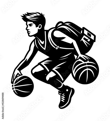Dynamic silhouette of a basketball player dribbling the ball, captured in a striking black and white graphic style.