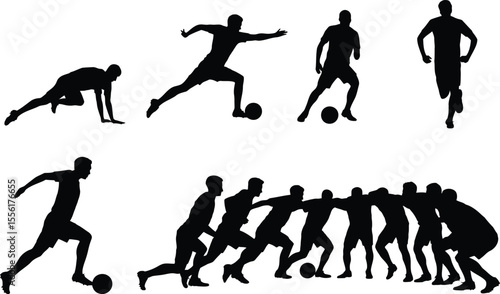 Soccer players silhouette, kicking ball, dribbling action, defensive stance, football athlete vector, sports illustration, dynamic movement, competition artwork, teamwork concept, game design