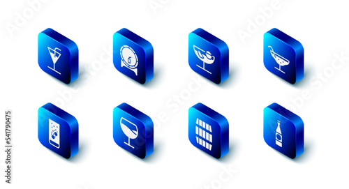 Set Isometric Cocktail, Wooden barrel on rack, Wine glass and Effervescent tablets water icon. Vector.