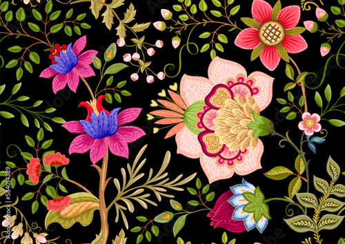 Fantasy flowers in retro, vintage, jacobean embroidery style. Seamless pattern, background. Vector illustration.